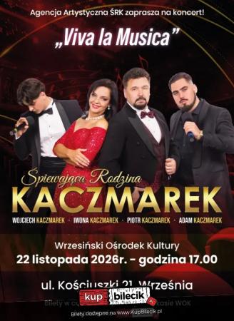 "Viva La Musica" to zupełnie nowy koncert jedynej w Polsce rodziny śpiewającej muzykę klasyczną. W wykonaniu Śpiewającej Rodziny Kaczmarek usłyszycie państwo tym razem najpiękniejsze melodie z operetki min. Wesołej wdówki, Hrabiny Marizy, Księżniczki Czardasza, czy Guditty, przeboje z musicali min: Skrzypka na dachu, My fair lady czy Upiora w operze, a także piękne standardy muzyki rozrywkowej, piosenki z repertuaru Franka Sinatry Elvisa Presleya, Poula Anki czy Luisa Armstronga.